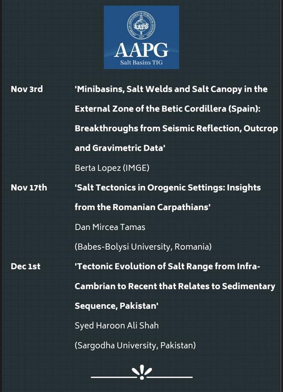 Topic: Dec 1 Salt Basins TIG Webinar: Tectonic Evolution of Salt Range from Infra-Cambrian to Recent that Relates to Sedimentary Sequence, Pakistan - Syed Haroon Ali Shah