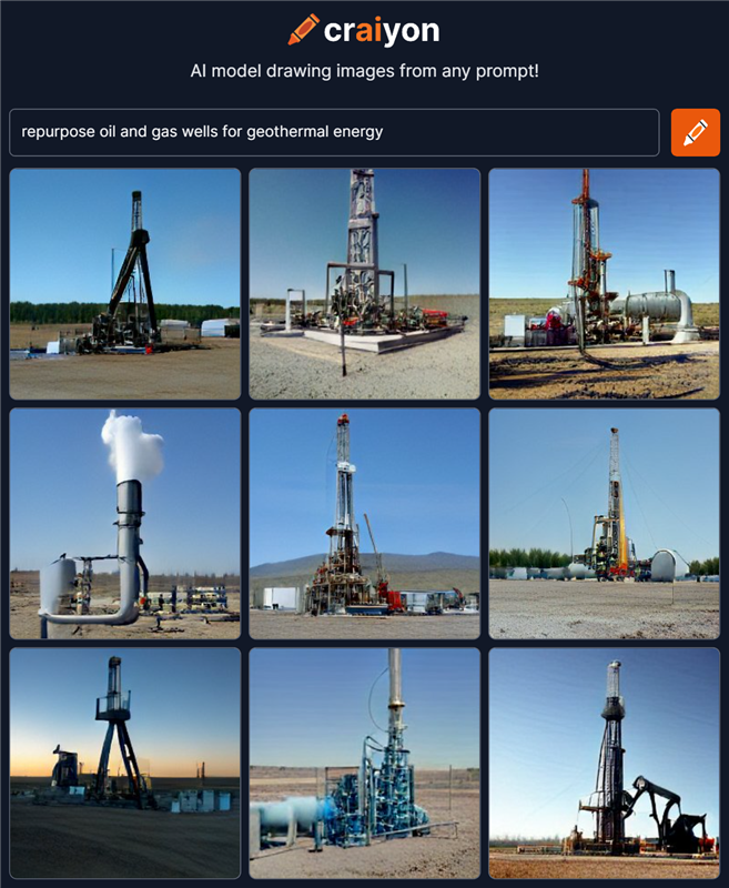 https://www.craiyon.com/ Type in "oil and gas gushers" and see. While that works like any image search engine, the opportunity lies in transfer learning. Next "repurpose oil and gas wells for geothermal energy" get the image attached.