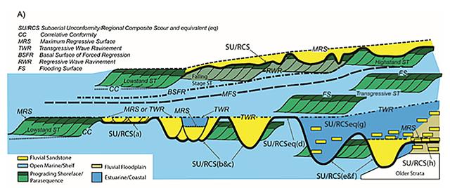 Of the three master surfaces that bind systems tracts (i.e., the subaerial unconformity [SU]; maximum regressive surface [MRS]; and maximum flooding surface [MFS]), two have recently seen substantive modification. Changes in assumptions for development of the SU and the MRS not only change their interpretive meaning, but also change how these surfaces are mapped. Newer views on scour of the sequence-bounding “subaerial unconformity” show that it does not actually record a surface of exposure and near complete bypass of sediment at lowstand as originally presumed, but rather records a composite surface formed by lateral migration and incision of rivers that ‘cut-and-cover’ the subaerial unconformity throughout regression.