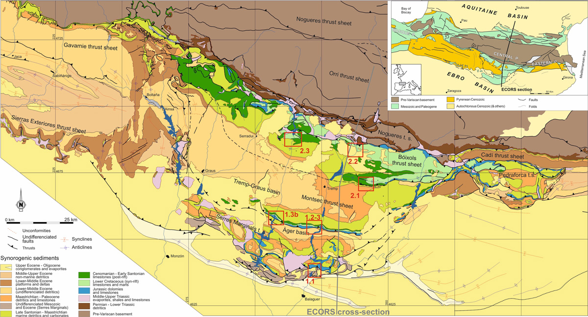 The Montsec thrust sheet developed from the Paleocene to the Early Eocene as recorded by continental to shallow marine sediments deposited in its footwall (Ager basin) as well as in the Tremp-Graus piggy-back basin. The lower Eocene sediments of these basins grade westward into the slope succession filling the Ainsa basin at the footwall of the Montsec thrust.