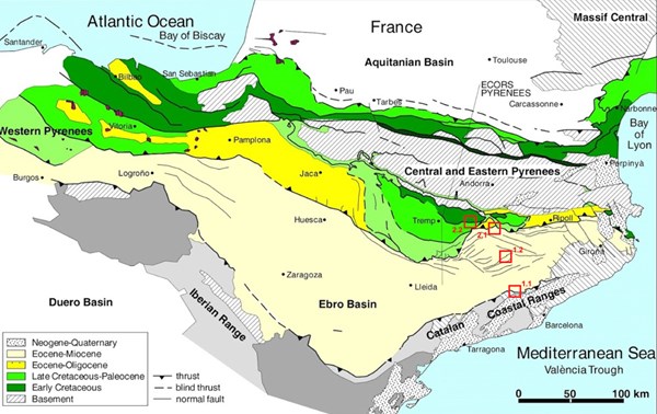 The main plan of this fieldtrip to the South Pyrenean Fold Belt is to have an overview of a fold belt and adjacent foreland basin through four well-exposed and well-known localities. Each example permits the discussion of different geological processes related to the interplay between tectonics and sedimentation and the role of salt-tectonics during both pre-compression rifting and during tectonic inversion.
