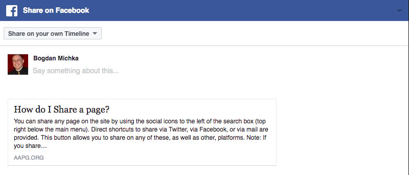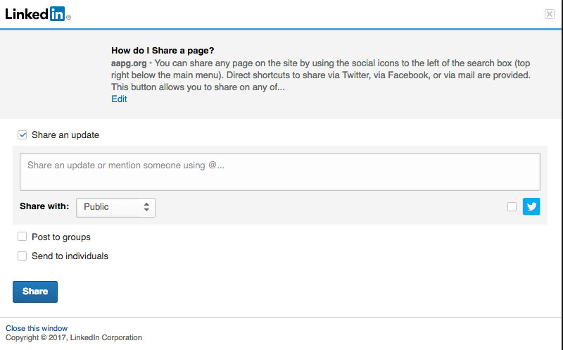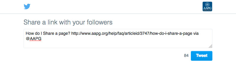 You can share any page on the AAPG website by using the social icons to the left of the search box (top right below the main menu).