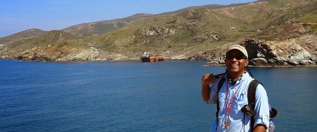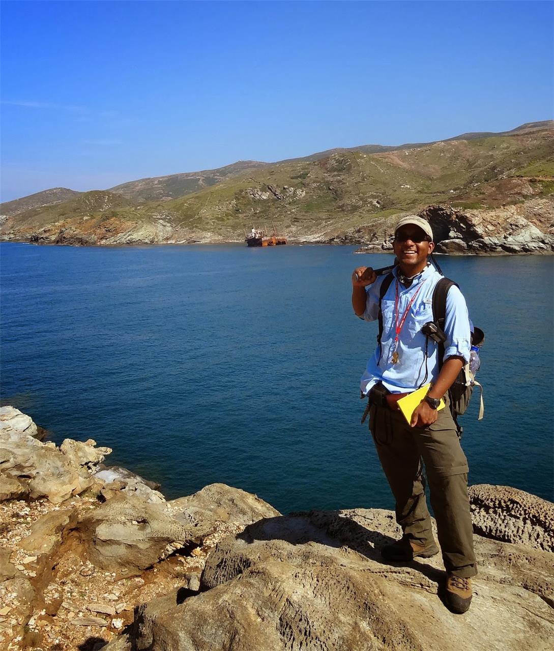 Tim Shin doing field research for his MS thesis at the Livada Detachment of retrogressed blueschists in the metamorphic core complex of Andros Island, Greece (2012)