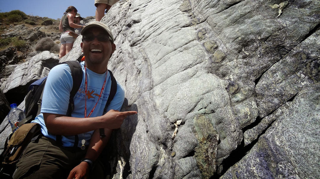 Tim crooning over a garnet-rich blueschist banding in an eclogite on Syros, Greece in a return to the field for his graduate research (2013)