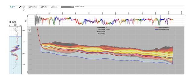 A computed profile from the Wolfcamp B using Factor Drive. The dotted red line is the wellbore trajectory. The blue zone is the most probable geologic structure, while the red-orange field indicates uncertainty about that answer. The good agreement in the type log correlations at left and predicted LWD along the top confirm the plausibility of this structure.