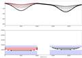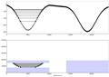 Constant to sinusoidally varying sediment input, on a background of sinusoidally changing subsidence. Sediment input curve is out of phase with subsidence curve. |