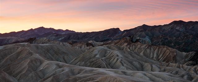 The photo above shows the barren, out-of-this-world beauty of Zabriskie Point taken on my trip there in December 2016. The colorful sunrise and diffuse light provide an excellent backdrop to the finely-sculpted badlands. For a more close-up perspective take a hike on the Badlands Loop, where visitors are treated to a multitude of amazing rock formations and impressive gulches.
